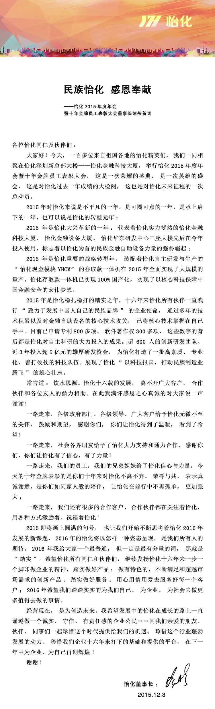 怡化2015年度年会暨十年金牌员工表彰大会董事长彭彤贺词
