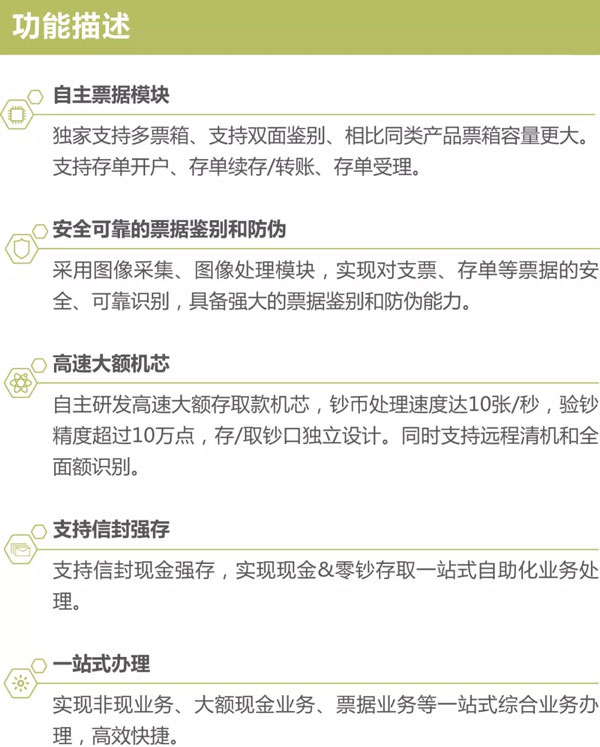 怡化CDS-550S智能一体机,定位于新一代“全能超柜”,集成超级柜台、高速大额、票据、强存四大业务于一体,最大限度地将个人及对公业务迁移至自助设备办理,精简人工柜台业务,通过客户自助和柜员引导辅助相结合的方式,为客户提供“一站式、自助化、智能化”服务。该产品功能全体积小,占地面积仅约1平米,布放灵活,安全便捷,是打造智能化、轻型化网点的“必选精品”。