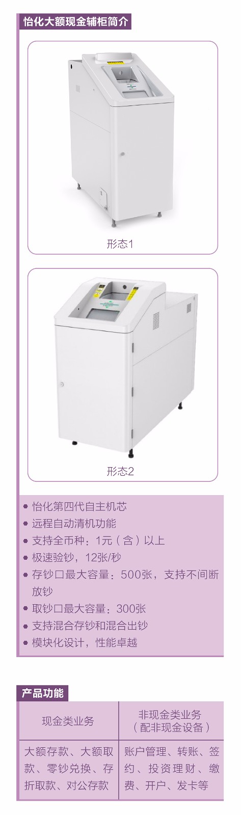 怡化大额现金辅柜采用自主研发具备知识产权的高速大额机芯,专注于大额现金的高速存取,其存取速度快、可连续放钞、并支持混存混取,支持零钞兑换业务,还兼具忘取回收功能,这将极大方便客户进行业务办理,减轻柜员压力,促进现金柜员向移动智能服务模式转型。
